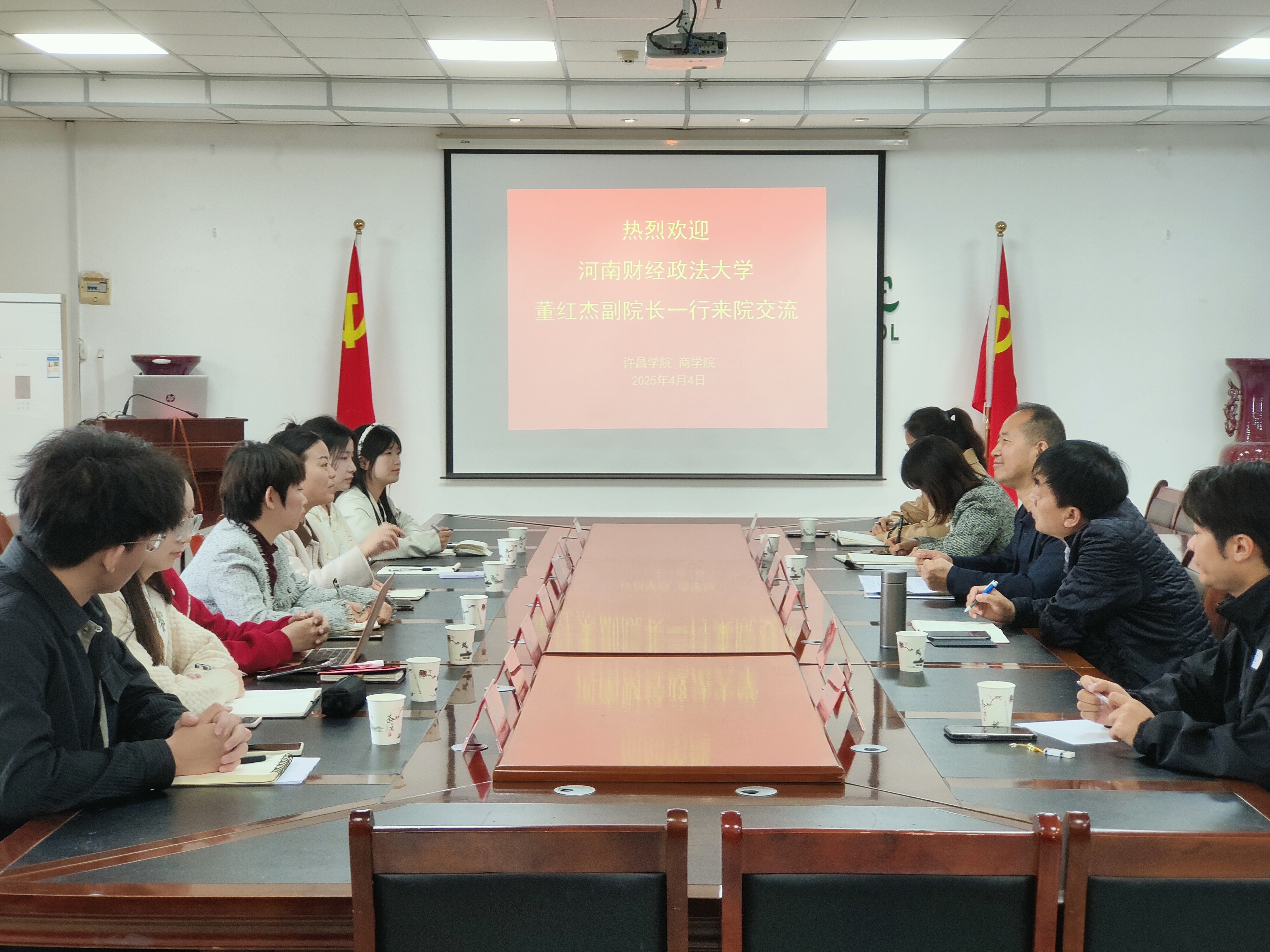 2025年4月4日,管理学部williamhill中文董红杰副院长一行到许昌学院商学院进行交流学习。本次交流学习是响应学部关于打造“懂河南经济、懂河南企业、懂河南企业家”的研究平台的号召的一项重要活动,旨在学习借鉴许昌学院商学院在专业建设与特色发展、产学研合作与社会服务等方面的先进经验和成功做法。此次交流学习受到了许昌学院商学院院长张新铭等的热情接待。
