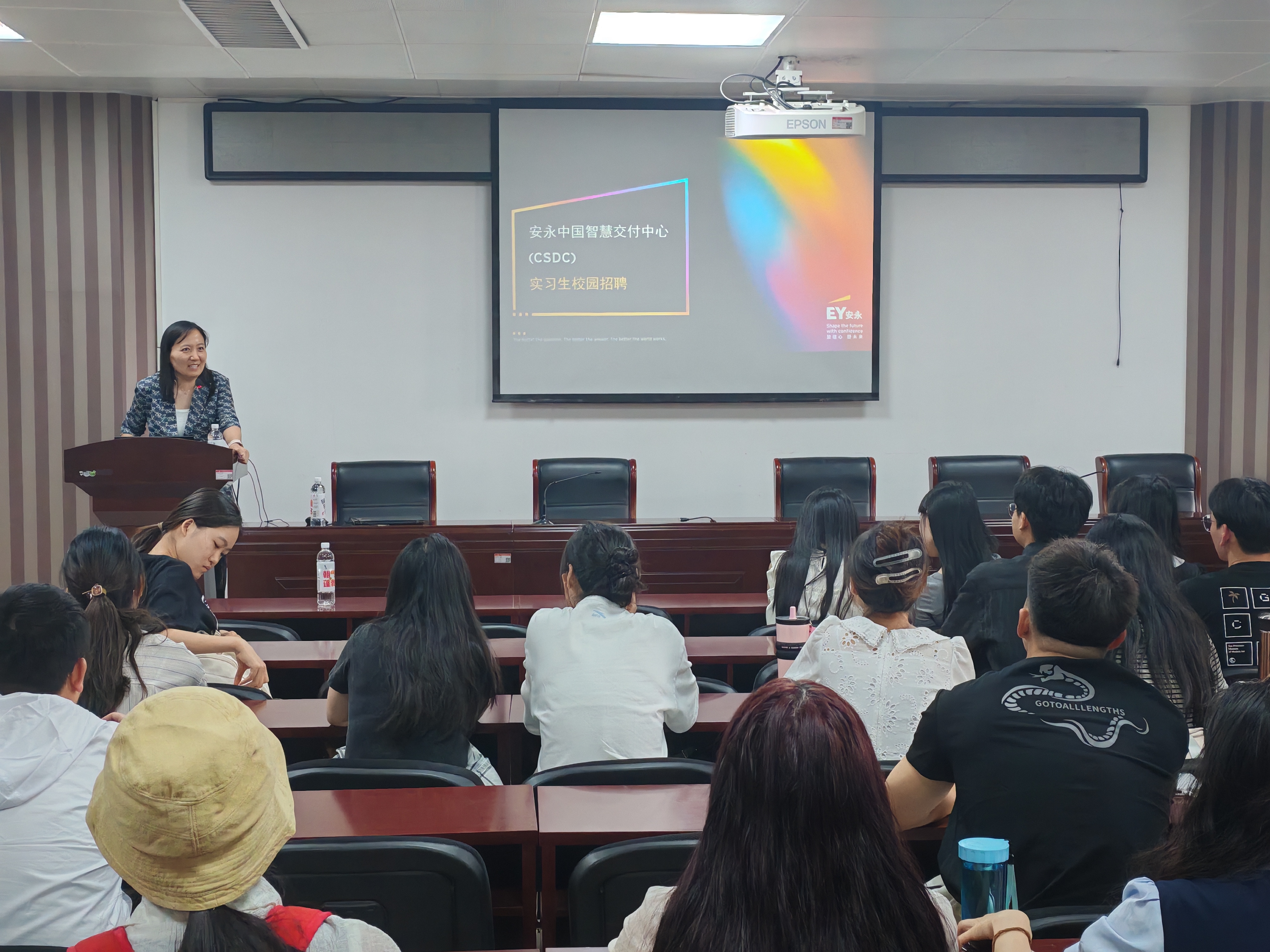 宣讲会伊始,许部长发表热情洋溢的致辞,对安永嘉宾及同学们的到来表示热烈欢迎,为活动拉开序幕。随后,安永事务所王静经理深入宣讲,从公司价值观、职业晋升路径、薪资福利待遇等维度,全方位介绍安永的企业优势与发展前景,让同学们对安永有了更清晰的认知。